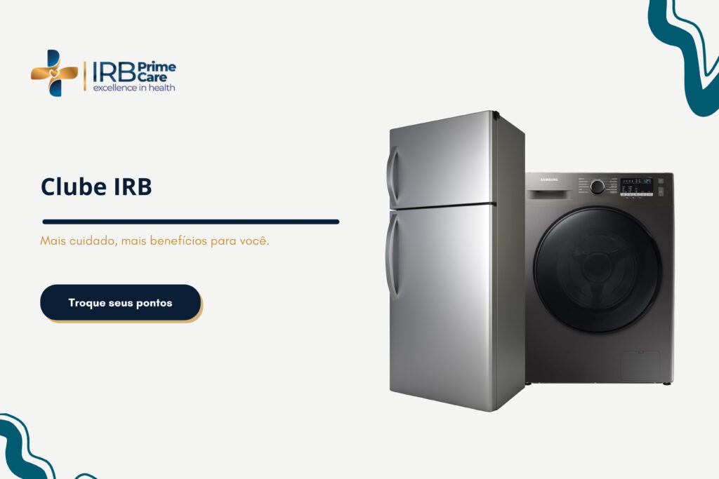 Club IRB Prime: Receba 1 ponto a cada R$ 2,00 gastos, para trocar por produtos da clínica ou parceiros.